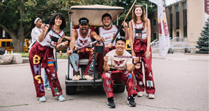 Jovan Popovic, President of the MSU, holds up the MSU flag alongside the Maroons, a unique MSU service that helps students learn more about the MSU
